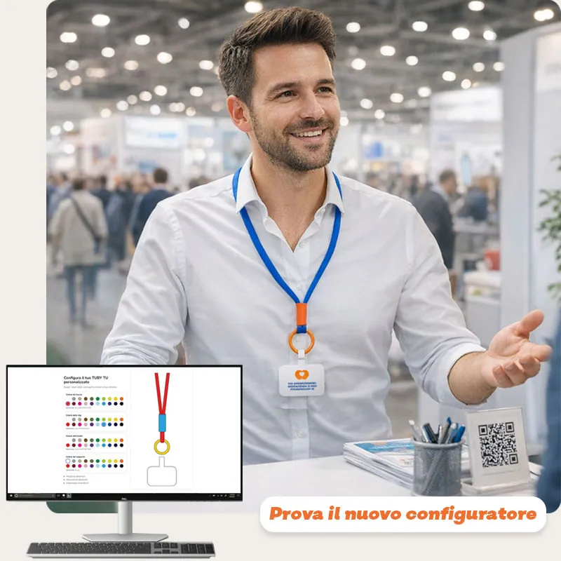 TUBY TU il lanyard personalizzato, non è il solito lanyard: è un sistema modulare che ti permette di creare combinazioni colore praticamente infinite per ottenere un gadget perfettamente in linea con il tuo brand. Se stai cercando un gadget estivo davvero nuovo, colorato e utile, ti presento TUBY TU, il nuovo laccio da collo personalizzabile pensato per aziende, eventi e attività estive.