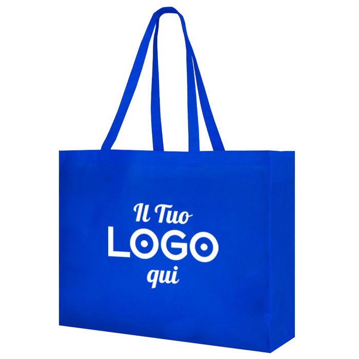 Borsa in TNT personalizzabile con logo, TNT da 80 g/m² . Con lunghe manici rinforzati da 75 cm, soffietti rinforzati alla base e ai lati con bordo coordinato e finitura cucita. Resistente fino a 4 kg.