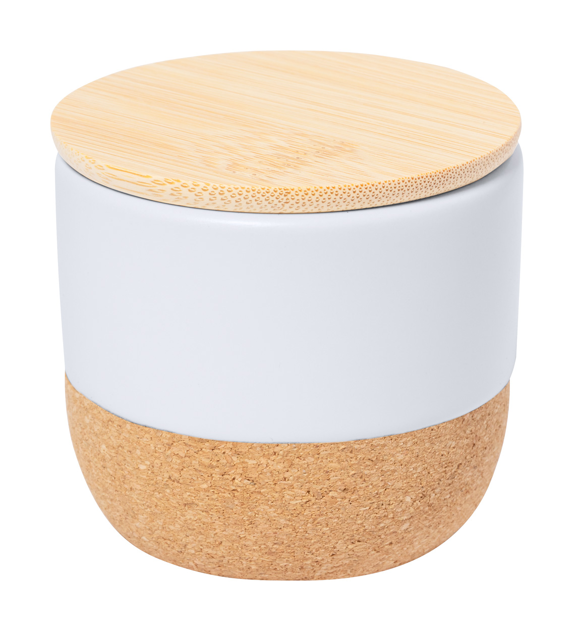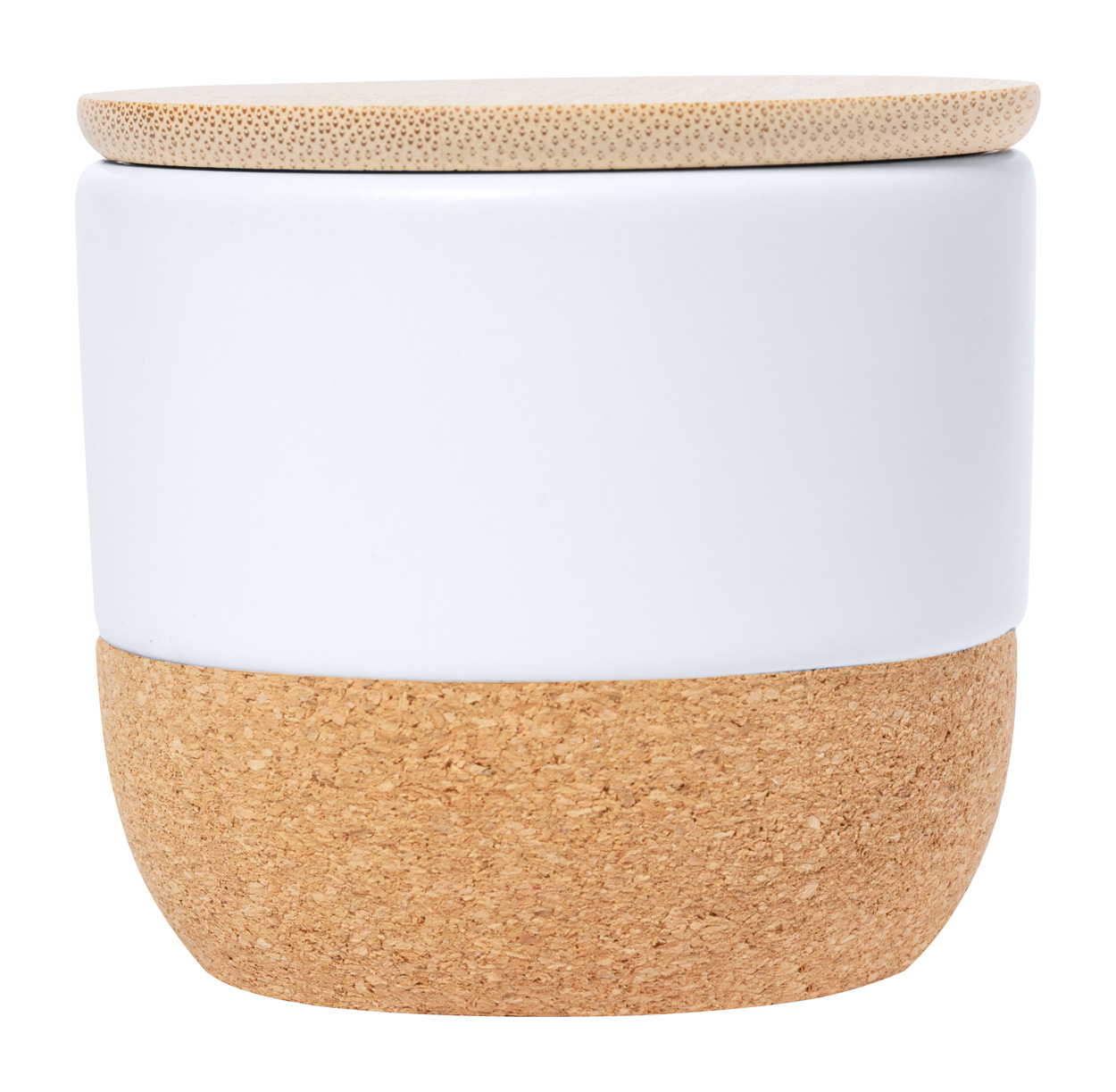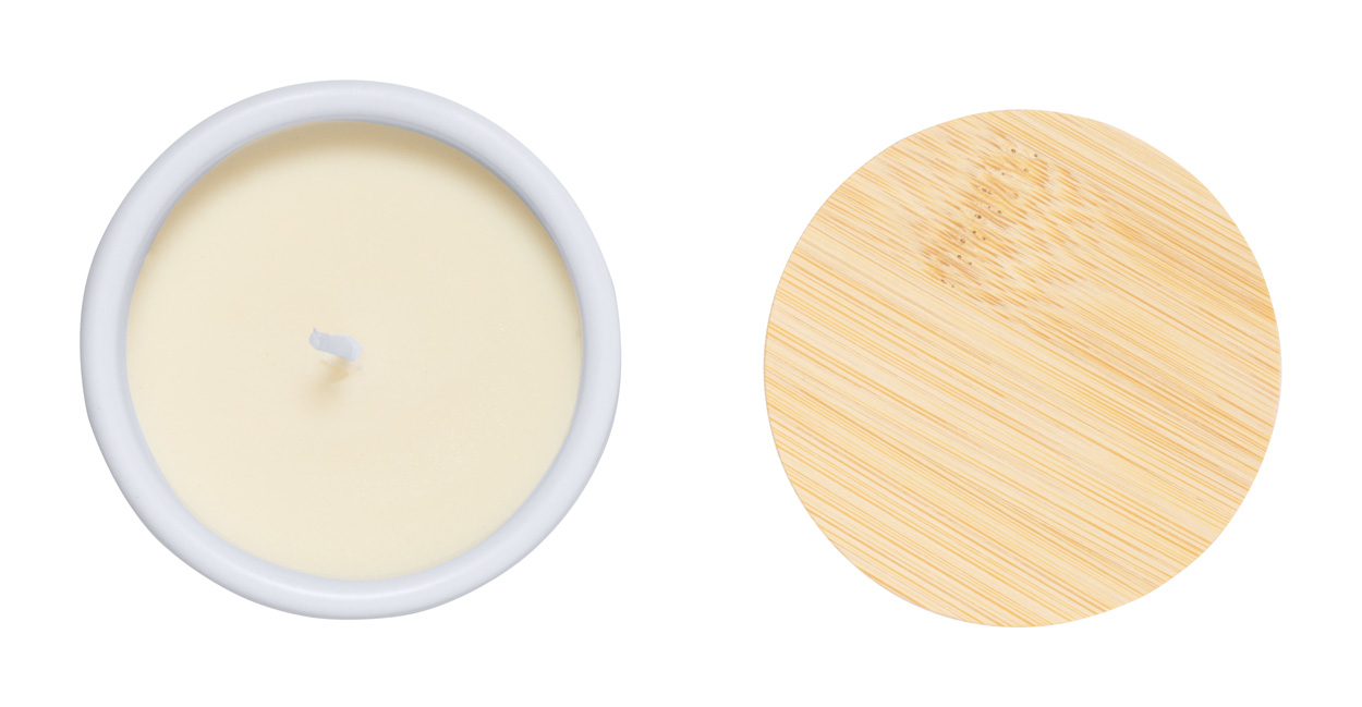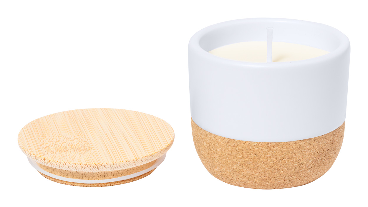 Candela in cera vegetale profumata alla vaniglia personalizzabile con logo in portacandela in ceramica, fondo in sughero naturale e coperchio in bambù.
