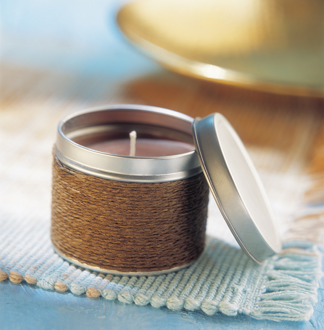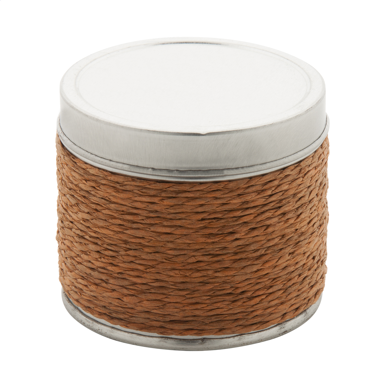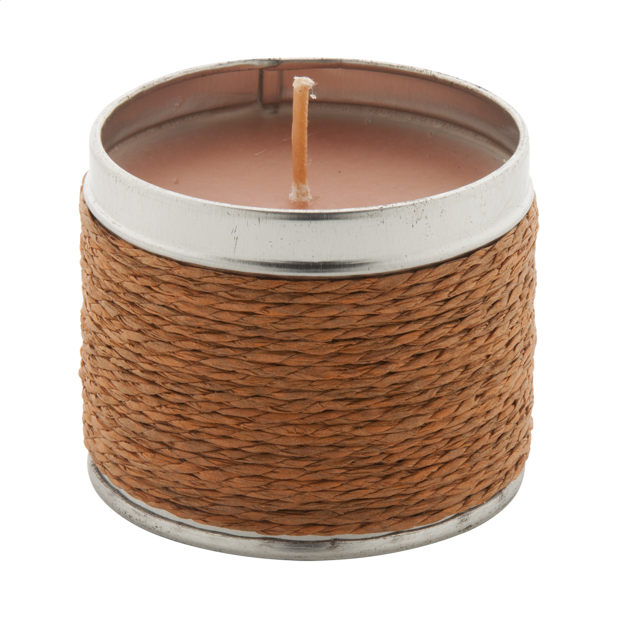 Candela profumata in latta con spago. Candela profumata in scatola di latta decorata con dello spago.