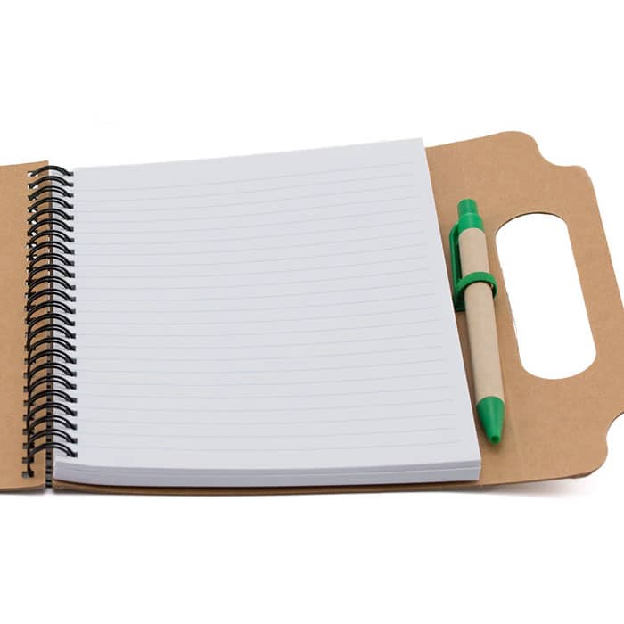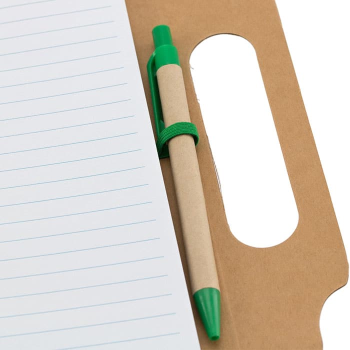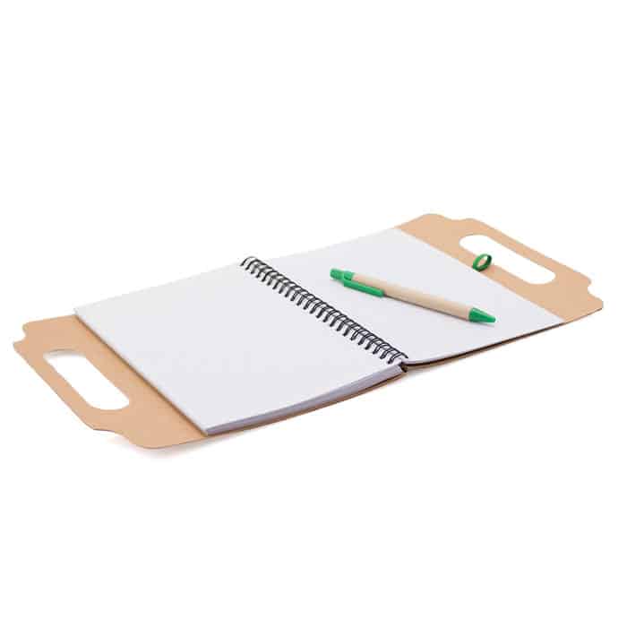 La cartella include anche una penna a sfera in cartone riciclato, alloggiata in un supporto incorporato per la penna. Questo significa avere sempre tutto a portata di mano, senza dover cercare strumenti di scrittura all’ultimo momento.