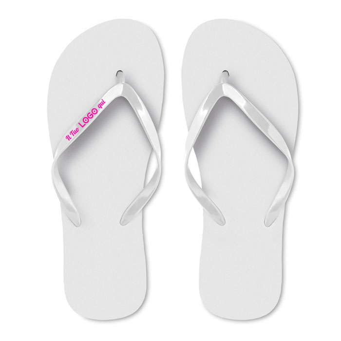 Infradito con suola in polietilene e strap in pvc personalizzabili con logo. Misura: 36-39. La personalizzazione è solo sugli strip dell’infradito (uno di default) non sulla suola.