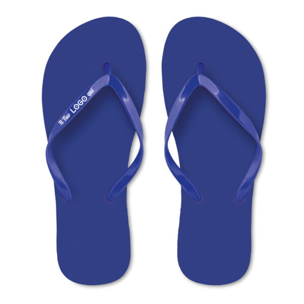 Infradito con suola in polietilene e strap in pvc personalizzabili con logo. Misura: 40-43. La personalizzazione è solo sugli strip dell’infradito (uno di default) non sulla suola.