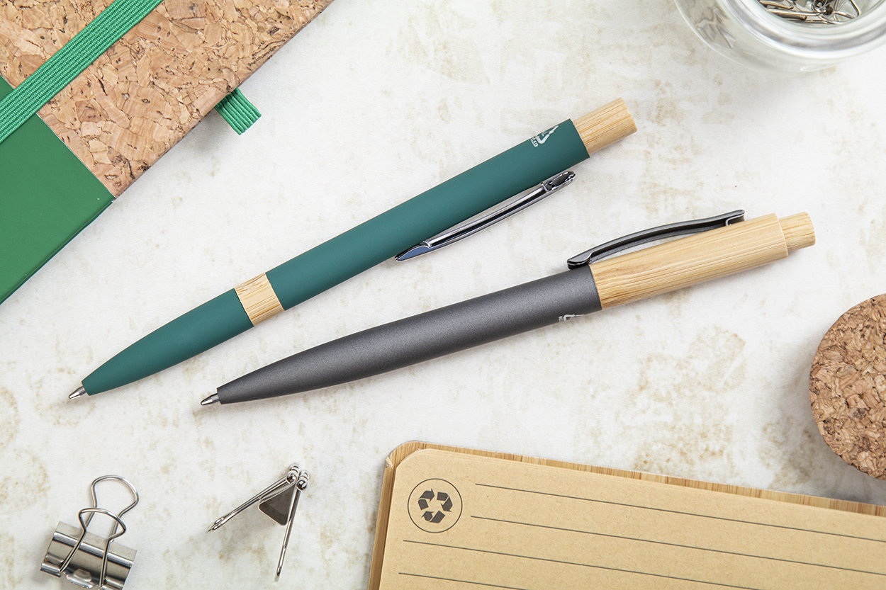 Descrizione: Penna a sfera in bambù e alluminio riciclato personalizzabile con logo