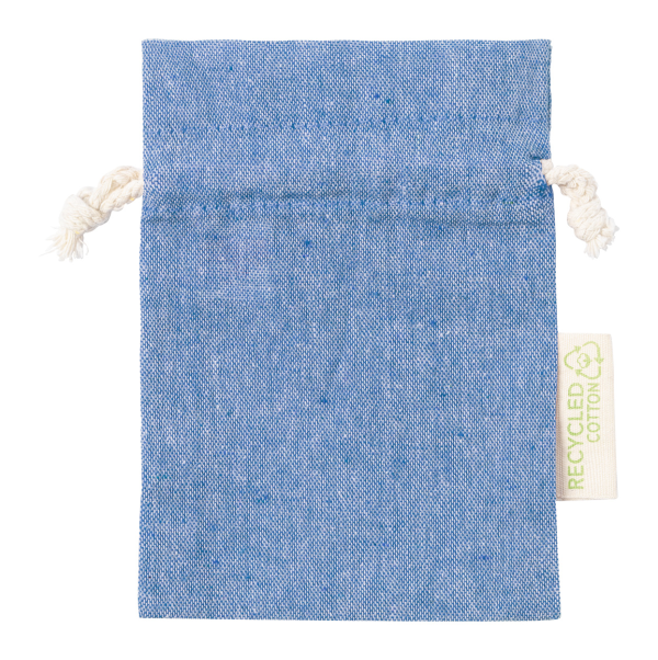 Sacca personalizzabile con logo in 100% cotone riciclato da 120 g/m² con chiusura a coulisse ed etichetta cotone riciclato.