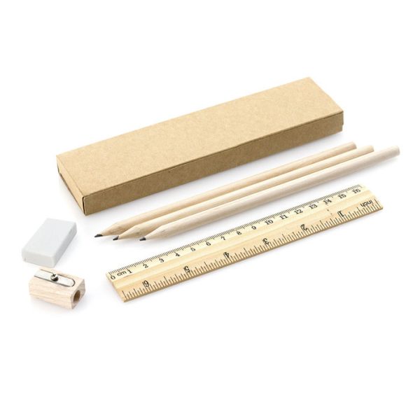 Set composto da 6 pezzi: 3 matite di legno con corpo tondo naturale e mina nero, righello da 20 cm con sistema metrico in centimetri / pollici, gomma e temperamatite. Presentato in scatola di cartone riciclato.