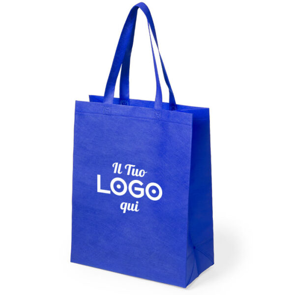 Shopper in TNT 80 gr personalizzabile con logo, con manici rinforzati da 50 cm, soffietti e finiture termosaldate. Resistenza fino a 9 kg di peso.