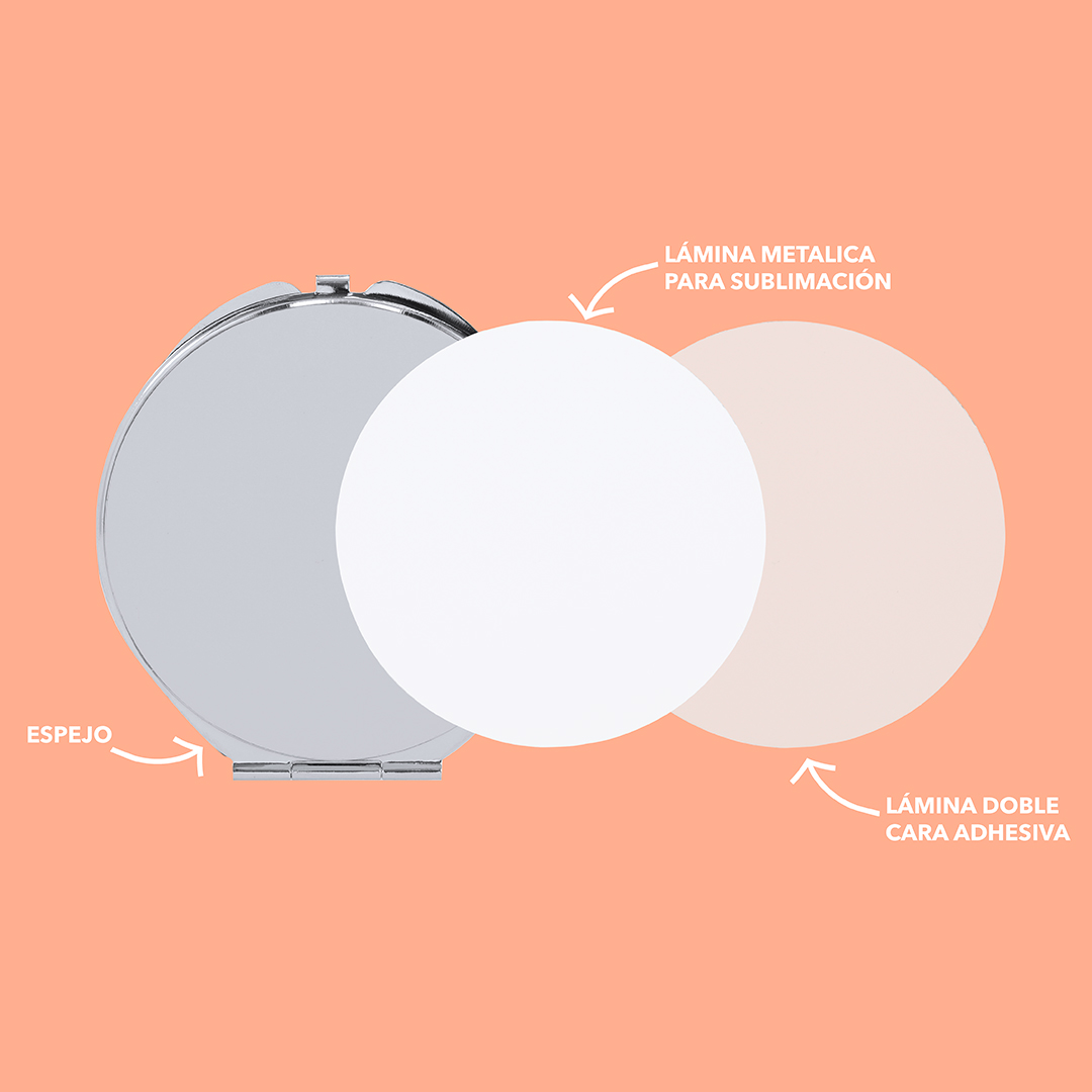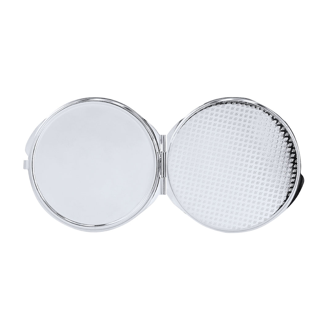 Specchio pieghevole metallico personalizzabile con logo. Con due specchi interni: 1X e ingrandimento 2X.