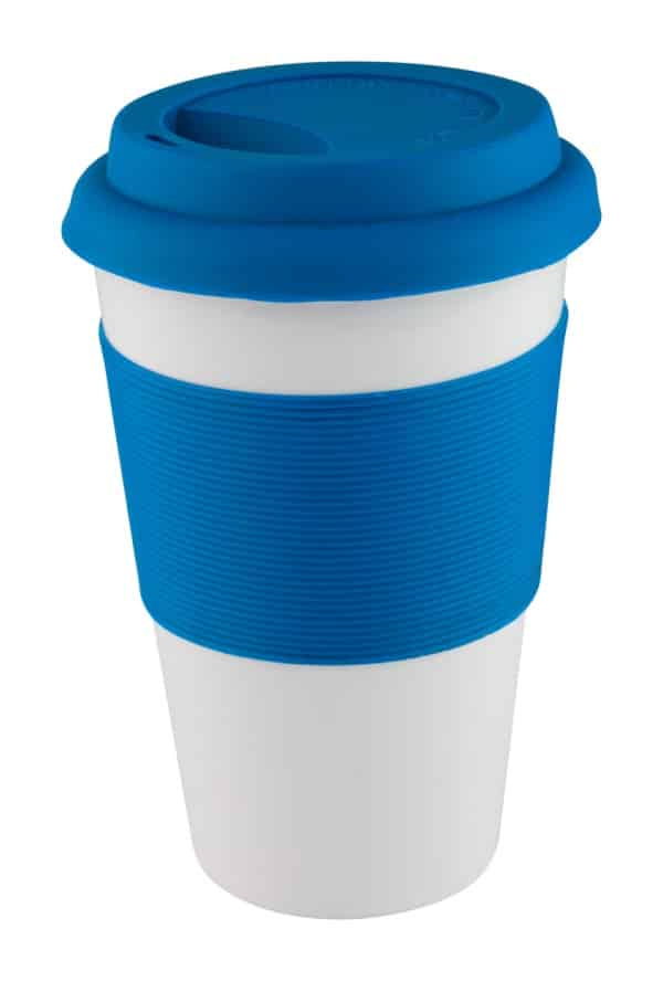Tazza in ceramica da 400 ml. con fascia e coperchio erogatore in silicone.