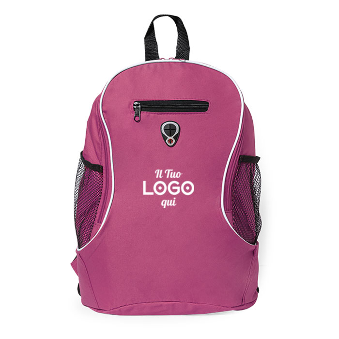 Zainetto economico Personalizzabile con logo resistente in poliestere 600D , con chiusura a cerniera, uscita per cuffie, tasca frontale con chiusura a cerniera e tasche a rete laterali.